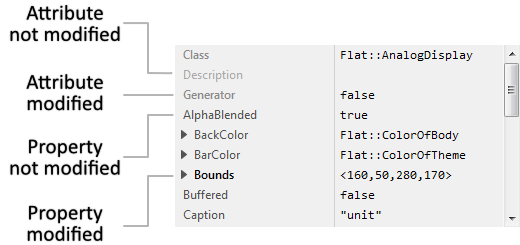 Please note the different fonts and colors used to distinguish the entries. All attributes affecting primarily the configuration of a member are displayed with gray names. In turn, initialization attributes (e.g. Default, Items, etc.) and properties belonging to an object are displayed consequently with black names. Furthermore, the names appear bold, if the corresponding values are modified:
