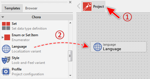 This section describes the Chora syntax of how languages are stored inside Embedded Wizard project files. The knowledge about the syntax can be helpful when you plan to process the project contents by third party tools. In particular, the general purpose Export and Import functionality introduced in version 14 requires a good understanding of how project members are represented in Chora syntax to correctly interpret the exported members and synthesize the Chora code for members to import. Please note, Embedded Wizard project files (and thus Chora code) are encoded as text in UTF-8 format.