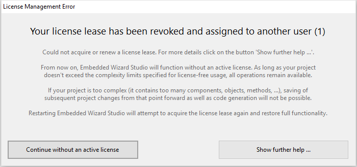 The caption in the upper area of the dialog informs you about the encountered problem. All possible problems are explained in the following sections including additional hints how to deal with each situation. In any case, errors reported in this dialog are not recoverable during the actual session. In order to continue using Embedded Wizard Studio with full licensed functionality you have to exit and start again Embedded Wizard Studio: