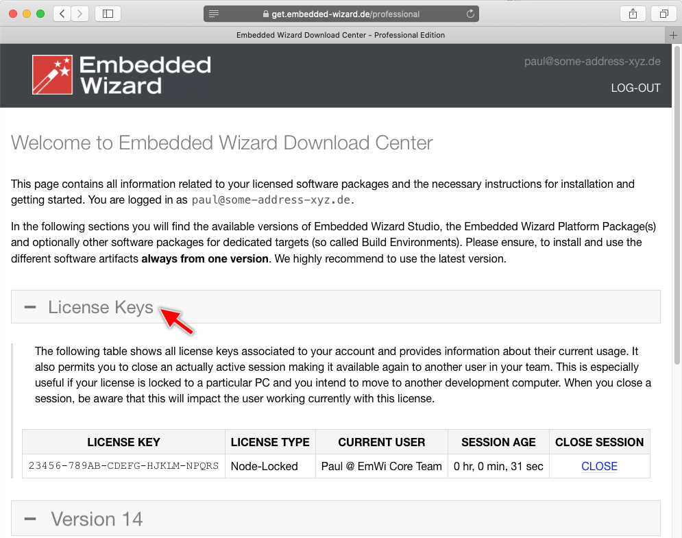 To close a session manually please log-in to our get.embedded-wizard.de download center. If you have no own account, please ask the responsible license administrator in your company to do this for you. On the download center please expand the section License Keys. Below this section you see all license keys associated to your account and an overview of their actual usage: