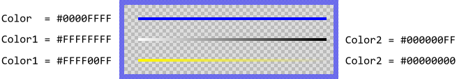 Starting with the version 11.00 the Line view calculates the resulting colors by modulating the values from the individual properties Color1, Color2 by the value from the common property Color. In this manner, you are able to specify colors in all properties simultaneously avoiding the unpredictable behavior found in the preceding version. From technical point of view, the modulation is performed by multiplying the color components (red, green, blue, alpha) from the individual property (e.g. Color1) with the corresponding components from the common property Color.