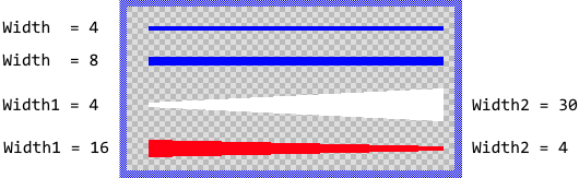 Per default line segments are drawn with 1 pixel thickness. This setting can be controlled by the property Width. Alternatively you can configure the line segment to appear trapezoidal with individual width at its start and end point. For this purpose use the properties Width1 and Width2. For example: