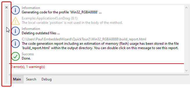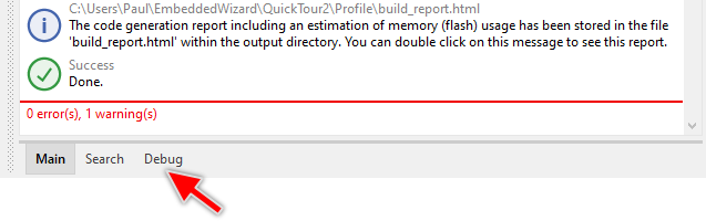 The messages are divided in the categories Main, Search and Debug. The first category Main collects all messages reported while working with Embedded Wizard. This includes error messages, warnings as well as all status and information reports. The second category Search is intended to collect all outputs produced by the project search operation. Finally, the third category Debug collects all messages generated by the trace or tracestack statement and is as such useful when testing and debugging the application.