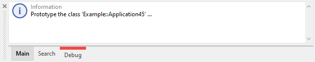 The Log window collects the messages in three separate lists represented consequently by three tabs Main, Search and Debug. To switch between these categories: