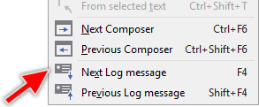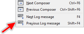 Besides the above described approach to inspect a single Log window message Embedded Wizard provides functionality to simply traverse through the collected messages. This is in particular very useful when there is a lot of messages collected and you need to inspect all of them step by step.
