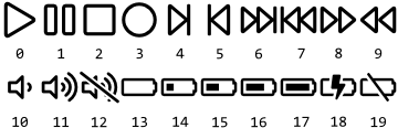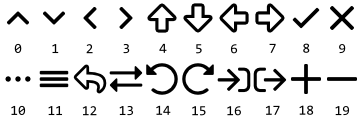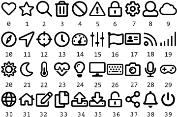 Please note, the default bitmap resources are multi-frame and they are stored in the ALPHA8 format. Thus when using them in an image view always specify the number of the desired frame as well as the color to colorize the bitmap. The following table shows the available bitmap resources. The numbers below the icons indicate the corresponding frame numbers: