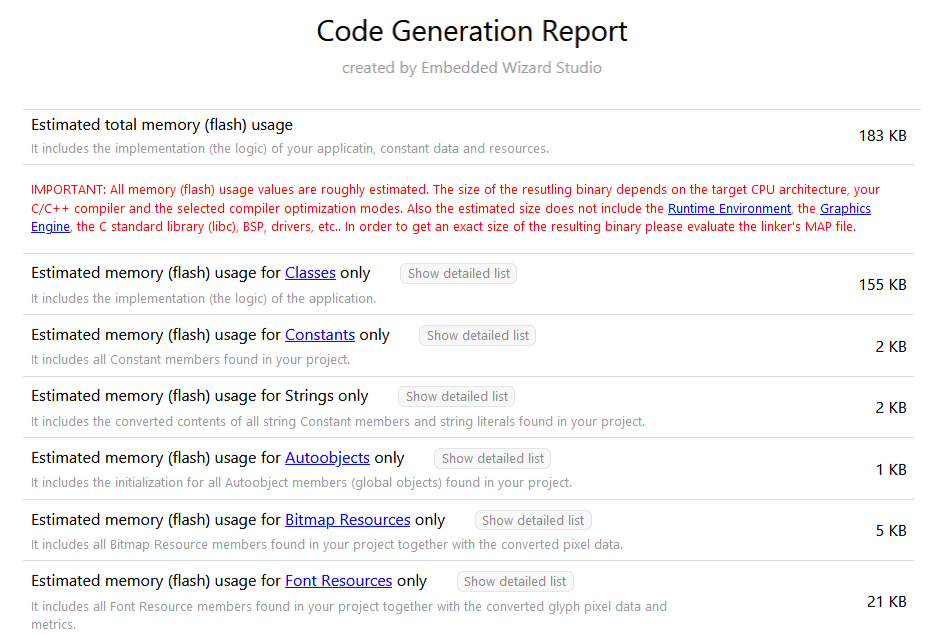 During the code generation Embedded Wizard Studio creates a Code Generation Report, containing an estimation of all above items. This report gives you a good overview of the expected flash memory usage of the GUI application. However, to get exact numbers of the entire binary file, the map file generated by your compiler / linker must be analyzed.