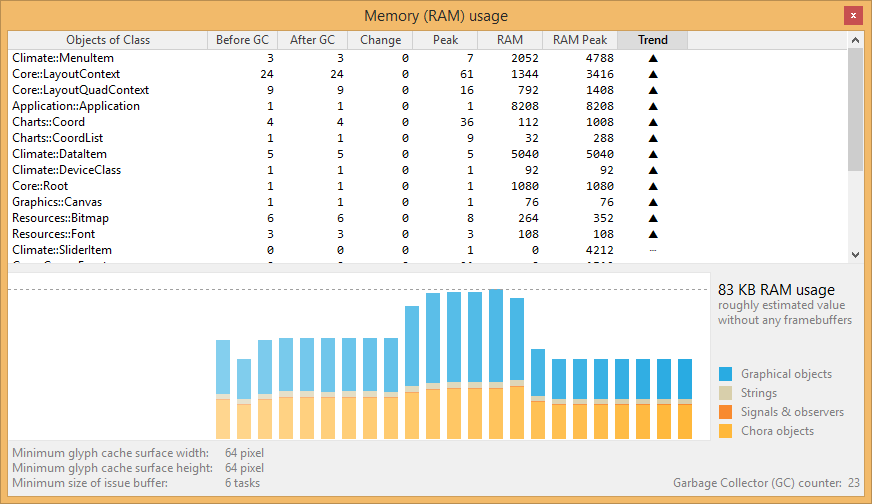 The window Memory (RAM) usage can be used to estimate the memory usage during prototyping: It tracks the memory usage of the entire GUI application. In the upper area the window lists all Chora object classes and their memory (RAM) usage. In the lower area, it displays the estimated total memory (RAM) usage of the tested application as a bar chart. The chart reflects the amount of memory needed by the application within the real target device. The window also gives the lowest possible configuration parameters for the glyph cache and issue buffers estimated during the runtime of the application.