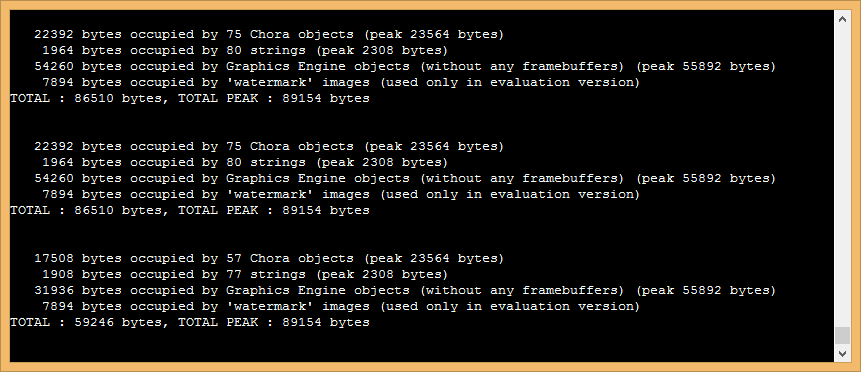 Chora Objects, Signals, Observers 15 KB Strings 2 KB Glyph Cache (64 * 64 * 1 Byte) 4 KB Bitmap Resources 0 KB Internal 10 KB ------------------------------------------------------------ Total 30 KB plus Scratch-Pad Buffer 320 * 24 Pixel * 2 Byte 15 KB plus optional Doublebuffer 320 * 24 Pixel * 2 Byte 15 KB ------------------------------------------------------------ Overall 60 KB