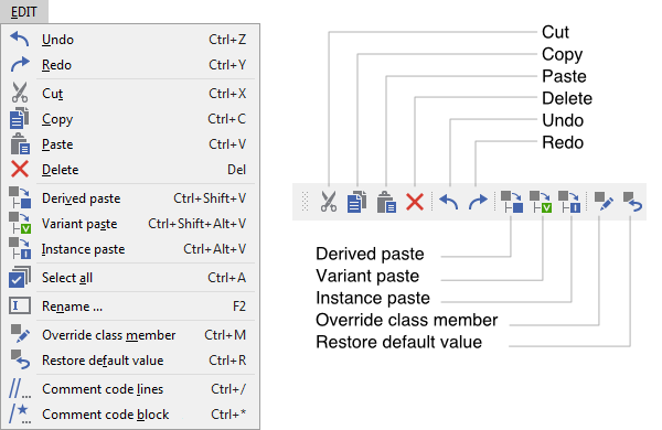 The menu and the corresponding toolbar contain commands for common editing operations: