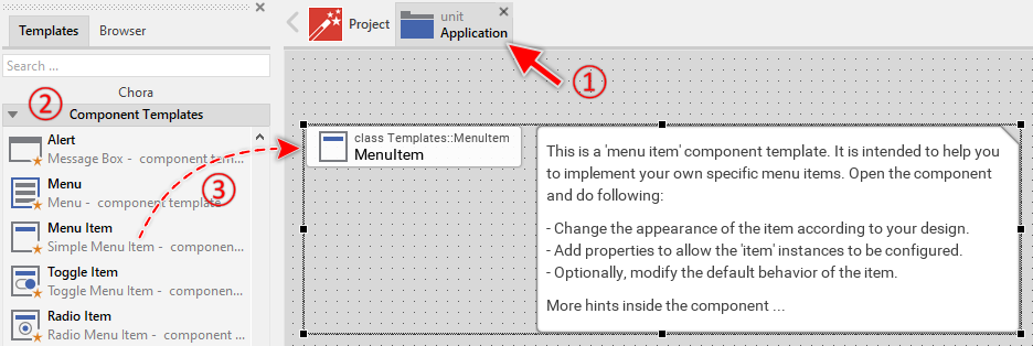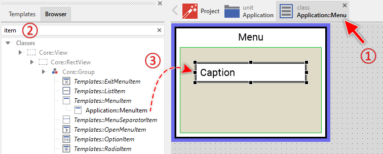 To create a new Menu Item component from a template you simply Drag & Drop it between the Templates window and the Composer with an opened unit. This is important in that by using the component templates you add in fact a new class to your project. Classes, in turn, can exist within units only. The following are the typical steps to create a new Menu Item component from a template: