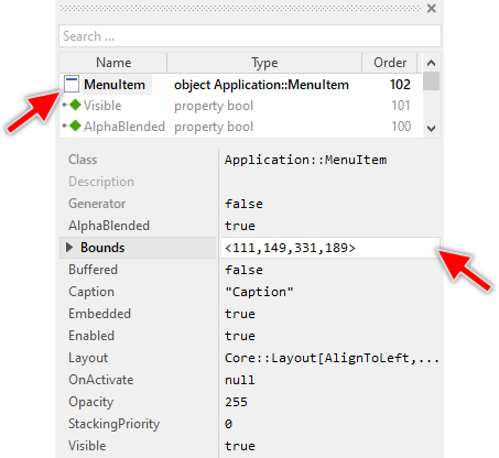 As long as the Menu Item is selected you can inspect and modify its properties conveniently in the Inspector window as demonstrated with the property Bounds in the screenshot below. This is in so far worth mentioning as diverse features of the Menu Item are controlled by the corresponding properties. If you are not familiar with the concept of a property and the usage of Inspector window, please read first the preceding chapter Compositing component appearance.