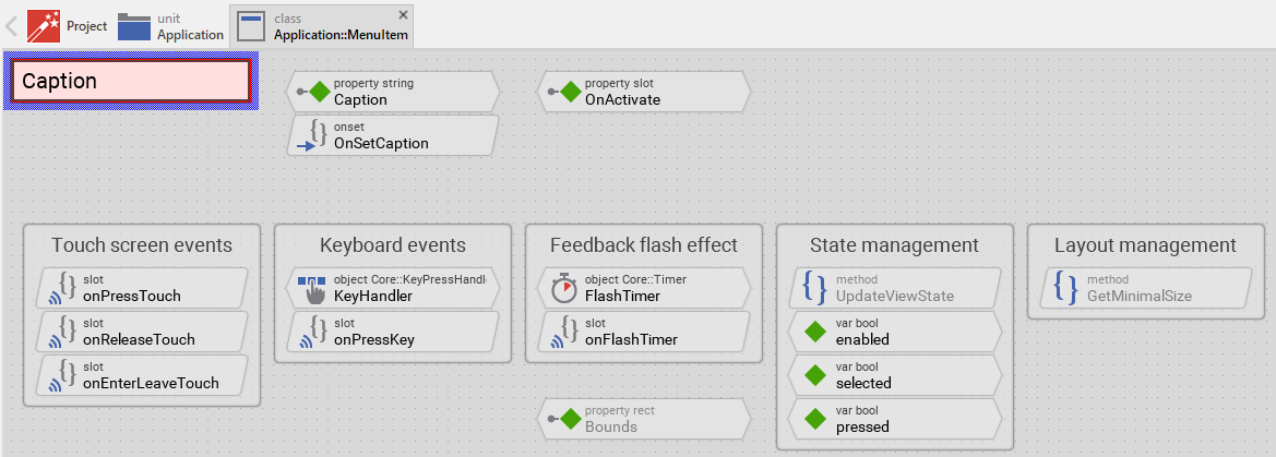 Usually, each particular setting within a component is represented by the corresponding property. Thus, an item where icon and background color can be configured will require two properties: one for the icon and one for the color. In its original version, the Menu Item contains already two properties Caption and OnActivate. The first stores the text to display and the second allows you to connect a slot method to be notified when the item is activated. In order to enhance this interface by your own properties, following steps are necessary: