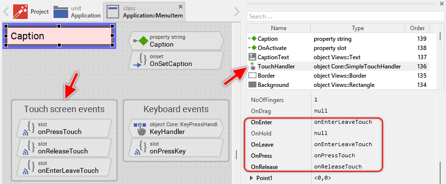 This Simple Touch Handler reacts to touch and mouse events and invokes the associated slot methods: onPressTouch, onReleaseTouch and onEnterLeaveTouch. |