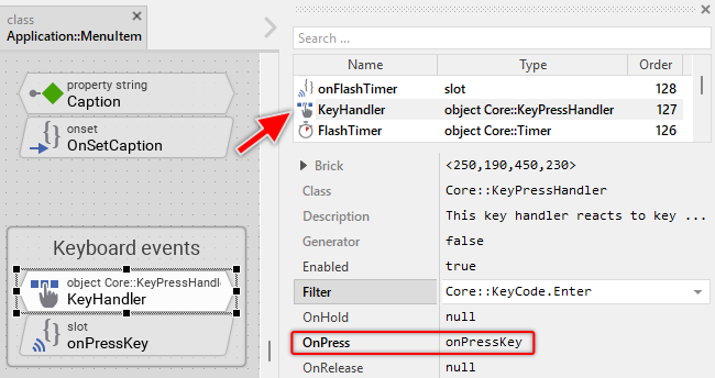 The Menu Item is an interactive component. It can be controlled via keyboard or hardware buttons. For this purpose the template contains the Key Press Handler object named KeyHandler. To this handler is associated the slot methodonPressKey. The method is thus invoked when the user presses the key matching the filter condition specified in the handler object. This is per default the Enter key: