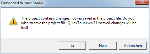 With this command you quit Embedded Wizard Studio. If there is currently a project opened containing unsaved modifications, Embedded Wizard will warn you as shown in the following screenshot giving you a chance to save the modifications before the project is unload: