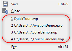 For your convenience Embedded Wizard remembers up to 9 (nine) recently used projects and list them in the bottom area of the menu. To open one of the projects click on the corresponding menu item: