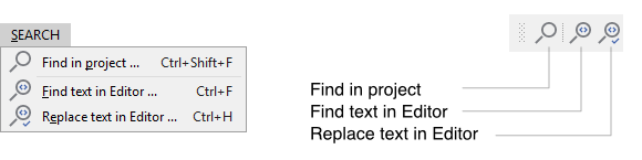 The menu and the corresponding toolbar provide commands for common search operations: