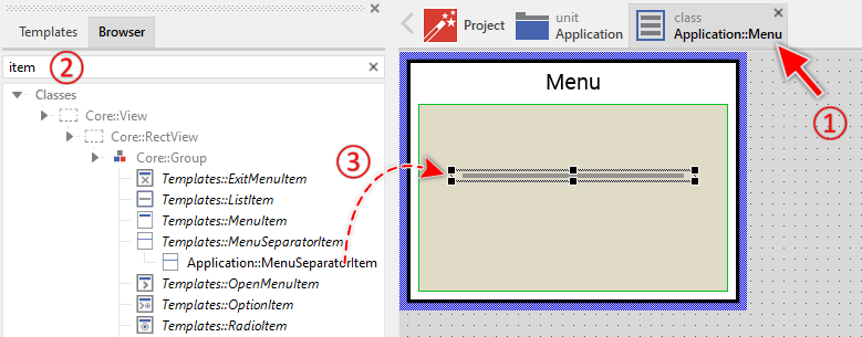 To create a new Menu Separator Item component from a template you simply Drag & Drop it between the Templates window and the Composer with an opened unit. This is important in that by using the component templates you add in fact a new class to your project. Classes, in turn, can exist within units only. The following are the typical steps to create a new Menu Separator Item component from a template:
