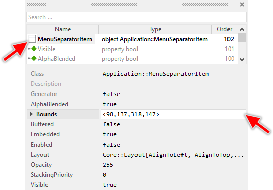 ★Within the Browser locate the class of the previously created Menu Separator Item. This can be done easily with Browser's own filter function.