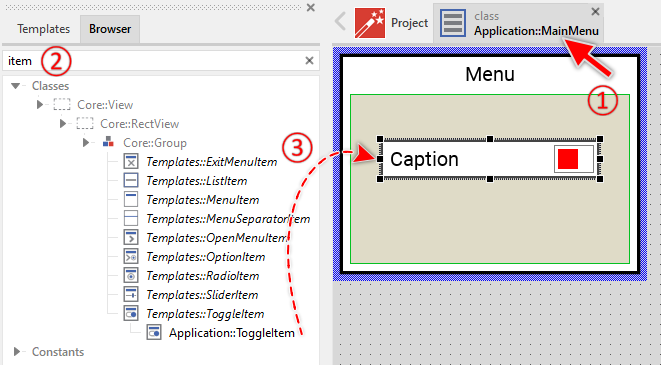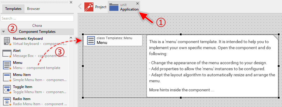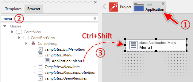 To create a new Menu component from a template you simply Drag & Drop it between the Templates window and the Composer with an opened unit. This is important in that by using the component templates you add in fact a new class to your project. Classes, in turn, can exist within units only. The following are the typical steps to create a new Menu component from a template: