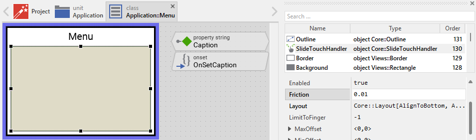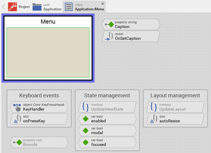 You can repeat the above steps for all individual menus you plan to implement in your application. Each derived menu component appears in the unit as a separate brick. From technical point of view it is a separate class descending from the common Menu component class.