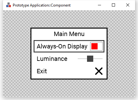 The initial size of the Menu is determined by the thick blue border surrounding the Canvas area. However, the Menu component is designed to automatically adjust its size according to the number and size of the enclosed menu items. This auto-sizing behavior is implemented in the autoResize slot method. When you start the Prototyper, you will notice that the menu adapts its size to fit all items.