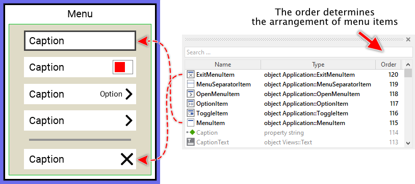 However, the order in which the items will be displayed at the runtime does correspond to the order in which the item objects are stored within the menu component. This is the order in which the items have been originally added. Consequently, the first added item appears at the top of the menu while the last added item is arranged at the end of the menu. See also the column Order in the members area of the Inspector window: