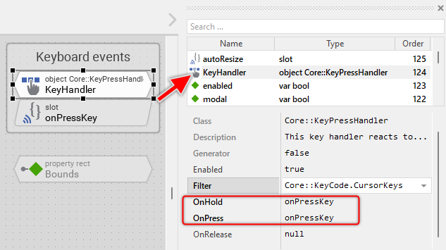 The Menu is an interactive component. It can be controlled via keyboard or hardware buttons. For this purpose the template contains the Key Press Handler object named KeyHandler. To this handler is associated the slot method named onPressKey. The method is thus invoked when the user presses a key matching the filter condition specified in the handler object. These are per default the cursor keys (Up, Down, Left, Right):