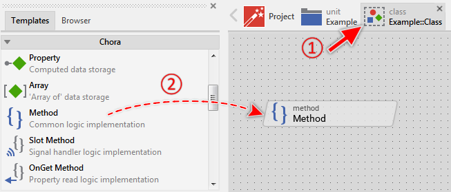 // This is a method not returning any values nor expecting parameters. \ // // $rect determines the position of the brick inside Composer window. $rect <10,10,210,50> method void UpdateStatus() { /* Some code to perform the update */ } // This is a method intended to perform some calculation. It expects two \ // parameter and returns a value. // // $rect determines the position of the brick inside Composer window. // $output imposes the code generation of the method regardless of its \ // usage inside the project. $rect <10,10,210,50> $output true method int32 Add( arg int32 aArg1, arg int32 aArg2 ) { return aArg1 + aArg2; } // This is a method inherited from a base class. Its return data type \ // and the parameter list are determined in the base class and can't be \ // changed in descending classes. // // $rect determines the position of the brick inside Composer window. $rect <10,10,210,50> inherited method UpdateLayout() { super( aSize ); SomeView.Bounds.size = aSize; }