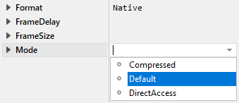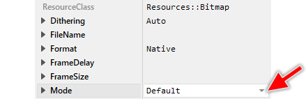 To inspect or modify the value of a Mode attribute, select first the affected bitmap resource member. Thereupon, the attribute is listed in the middle area of Inspector. Please note the assistant you can activate by clicking on the button