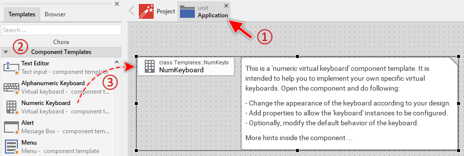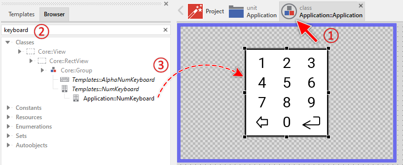 To create a new Numeric Keyboard component from a template you simply Drag & Drop it between the Templates window and the Composer with an opened unit. This is important in that by using the component templates you add in fact a new class to your project. Classes, in turn, can exist within units only. The following are the typical steps to create a new Numeric Keyboard component from a template:
