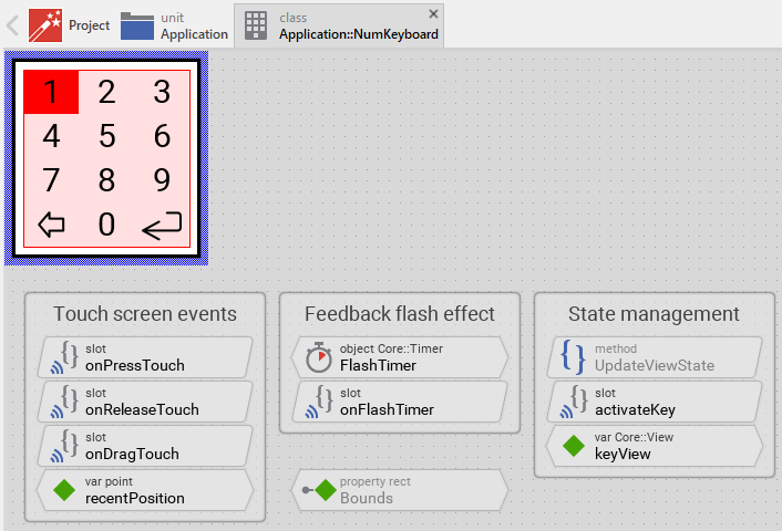The Numeric Keyboard is an interactive component that responds to touch and mouse inputs. For this purpose the template contains the Simple Touch Handler object named TouchHandler. The touch handler covers the entire keyboard area where keys are located. To this handler are associated three slot methods: onPressTouch, onReleaseTouch and onDragTouch. As their names imply the methods are invoked at the beginning of the interaction (press), at its end (release) and repeatedly while then user drags the finger (mouse pointer) inside the handler's area: