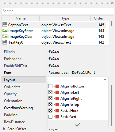 To control the adjustment you have to explicitly configure for each view its Layout property (see also Configure component layout). Let's assume, in order to display a caption text you have added a Text view to the Numeric Keyboard. Then you have arranged the view within the Canvas area according to your design expectation. If you want that the view remains aligned at the top edge filling the width of the component when it is resized, you configure its Layout property as shown below: