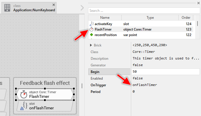 The Numeric Keyboard provides visual feedback when keys are pressed. For longer key presses, the feedback is immediate - the key appearance changes while the user holds it. However, for very quick taps (shorter than 50ms), the key press and release happen so fast that the user might not see any feedback. To solve this, the keyboard uses a flash effect timer. The flash effect is implemented using the Core::Timer object named FlashTimer. The timer prolongates thereupon the visual effect. As soon as the timer expires, it signals its associated slot method: onFlashTimer: