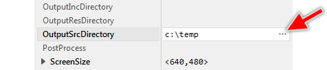 Please note, the attribute can be hidden if the Platform Package selected in the particular profile member doesn't support separate directories for source files. In such case use the attribute OutputDirectory to specify a common directory valid for all generated files. See also the associated attributes OutputIncDirectory and OutputResDirectory.