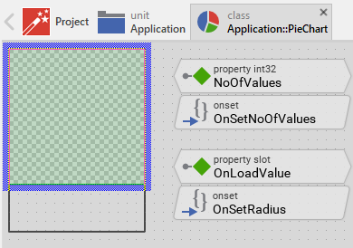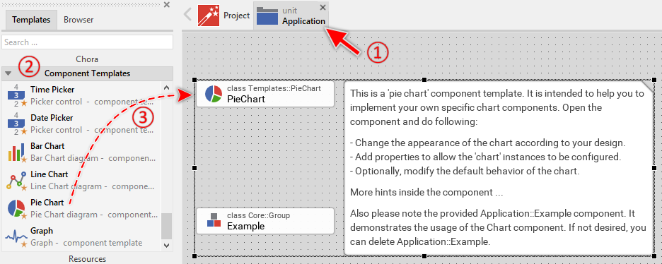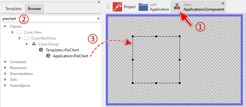 To create a new Pie Chart component from a template you simply Drag & Drop it between the Templates window and the Composer with an opened unit. This is important in that by using the component templates you add in fact a new class to your project. Classes, in turn, can exist within units only. The following are the typical steps to create a new Pie Chart component from a template: