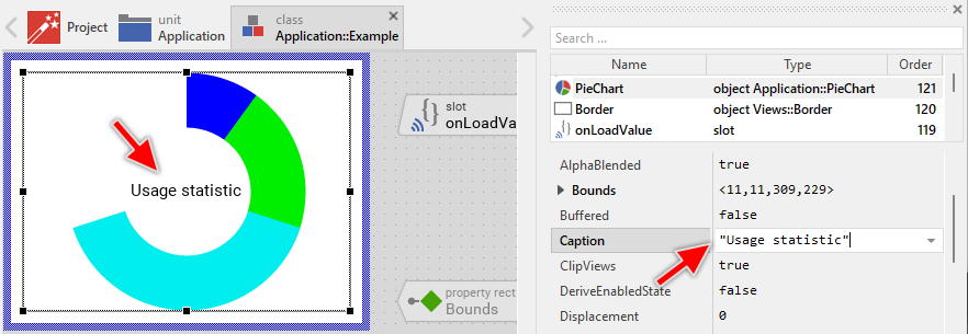 The property OnLoadValue should refer to a slot method, which will be invoked by the chart component in order to load the data for a given slice. The slot method receives no parameters. Instead, within the slot method implementation you access the Index variable to identify which slice is being loaded, and set the Value and Color variables to specify the slice's data. When the referred property is modified by other widget or the application logic, the Pie Chart is automatically notified to remain in sync with the property. |