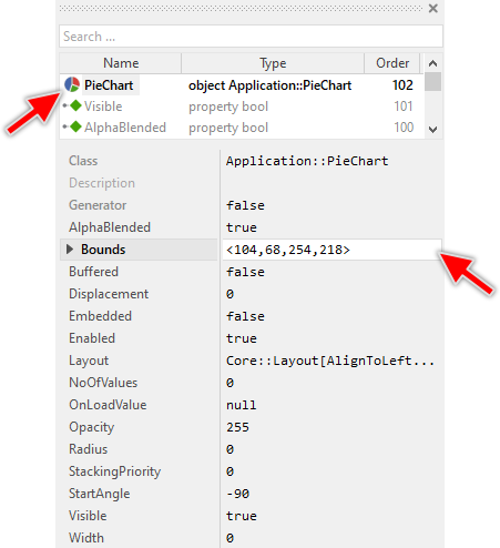Once added to the component, you can freely move the Pie Chart instance, or you simply grab one of its corners and resize it in this way. You can control the position and the size of the component also by directly modifying its property Bounds. If you want the Pie Chart to appear behind other views you can reorder it explicitly.