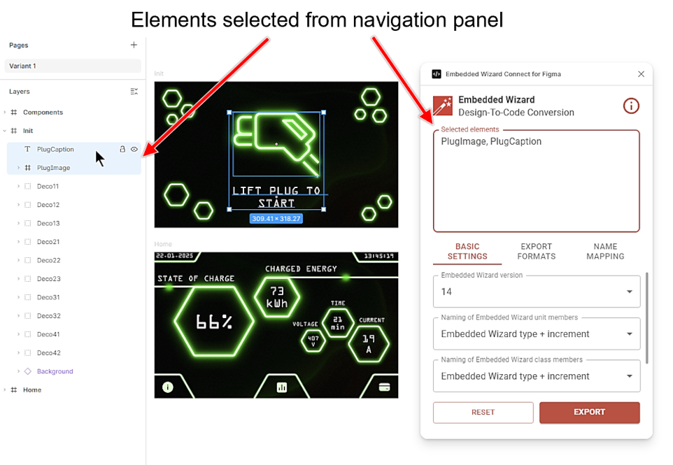 For an export, it is necessary to select one or several elements. Elements can be selected from the Figma canvas area or from the navigation panel on the left side. It is possible to select the entire content of the page, single frames, groups, sections, or just one single element. Generally, there are no limitations on which elements can be converted to an Embedded Wizard unit. The text field Selected elements will be populated according to the current selection.