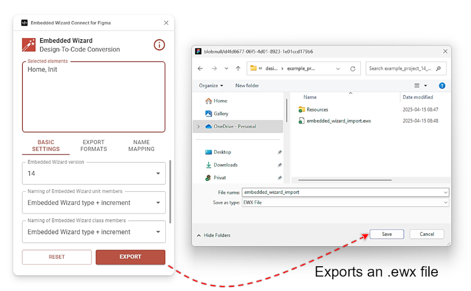 When the button is pressed, the plugin converts the selected Figma note into an .ewx file. This process typically takes a few seconds, but for very large designs, it may take a few minutes. Once the .ewx file is ready, a download dialogue will appear. The .ewx file can be stored anywhere on the hard drive, but it is recommended to save it in the project folder of the Embedded Wizard project where the import will occur.