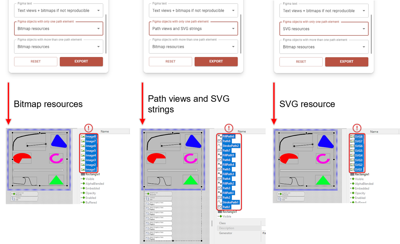 Figma internally handles almost all graphical objects as vectors. Consequently, its export feature allows for exporting either individual design elements or the entire design as SVG resources. However, due to the extensive complexity of the SVG standard, Embedded Wizard supports only a subset of the SVG standard. This limitation also applies to the Embedded Wizard Connect for Figma plugin. As described in the previous section, the plugin parses the SVG content of a Figma object to identify the attributes it uses. While Embedded Wizard's SVG feature supports a wider range of attributes, the Embedded Wizard Connect for Figma plugin currently only supports the <d></d> attribute. Unlike the previously explained settings, here the term more than one path element refers to cases where multiple <d></d> attributes are used to reconstruct the graphical object. If this requirement is met, users can choose whether to export the Figma object as SVG or bitmap resources.