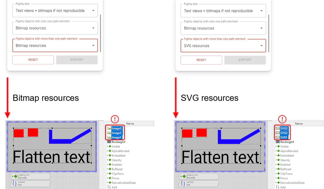 ★One resource per component/instance: This option exports a single bitmap or SVG resource for each component and instance. When selected, the plugin attempts to optimize the reuse of image resources wherever possible. For resource optimization to work, both the main component and its instance must be selected. Reuse is only achievable if the instances remain unmodified, apart from adjustments to the contained text.