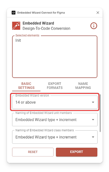 By default, the plugin always exports the content for the latest available Embedded Wizard version. If it is desired to export the content for an older version, this setting can be used. Please note that no versions older than Embedded Wizard 14 are supported. For all users who want to use the Figma export feature, we recommend upgrading to the latest Embedded Wizard version.