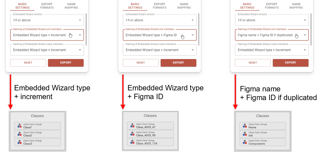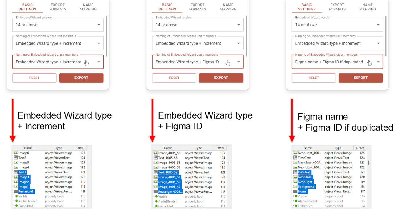 ★Embedded Wizard type + increment: This naming option uses the type of the Embedded Wizard unit member (e.g., Class, String), followed by an incremental number. It ensures clean naming that adheres to the Embedded Wizard naming conventions. However, a drawback is that the names may change when additional design objects are added to the Figma project.
