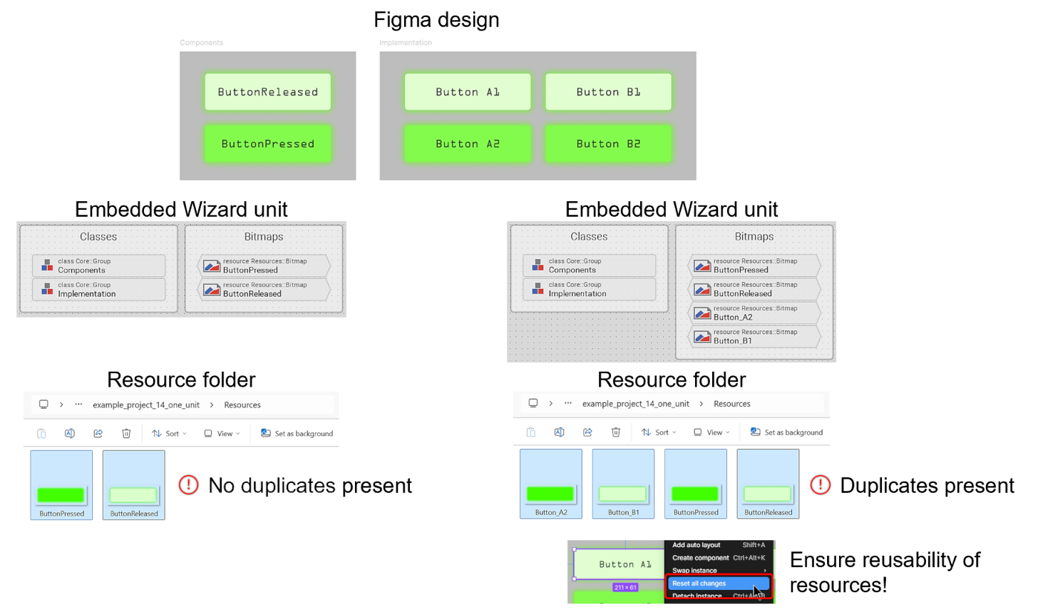 If resource reuse does not function as intended, it is likely due to certain properties of the instance being altered. If these changes were accidental, all modifications can be reverted to ensure the instance matches the parent component. Todo so, please perform Right click on the instance and select Reset all changes. The only modification allowed while still enabling resource reuse is altering the text within instances. For example, changing the caption of a button instance will still permit the button image to be reused. Please refer to the following illustration for further clarification:
