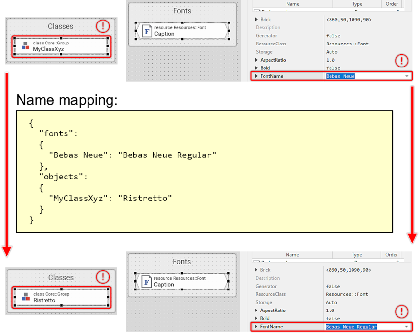 A detailed example of a successful name mapping operation is provided in the illustration below. In this example, unit member names and font names are adjusted to align with the desired naming conventions and installed fonts. The name mapping feature allows for renaming unit members, class members, and font names withing font resources. For instance, the class MyClassXyz was renamed to Ristretto, and the font name Bebas Neue was renamed to Bebas Neue Regular.