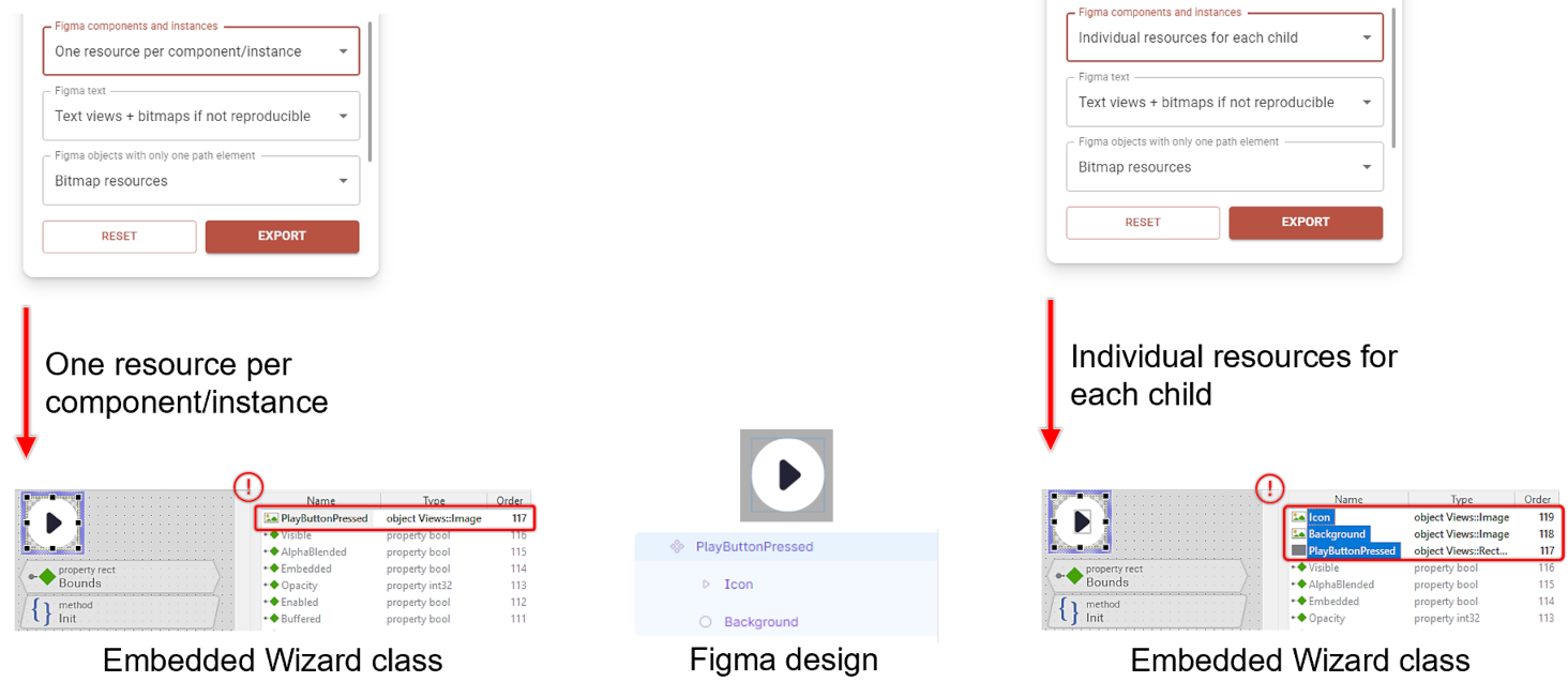 ★Figma name + Figma ID if duplicated: With this option, class members are named after their corresponding Figma objects. If a name is already in use by another class member, the Figma ID is appended to create a unique name. This option also consistent naming. Names that deviate from the Embedded Wizard naming convention will be adjusted accordingly.