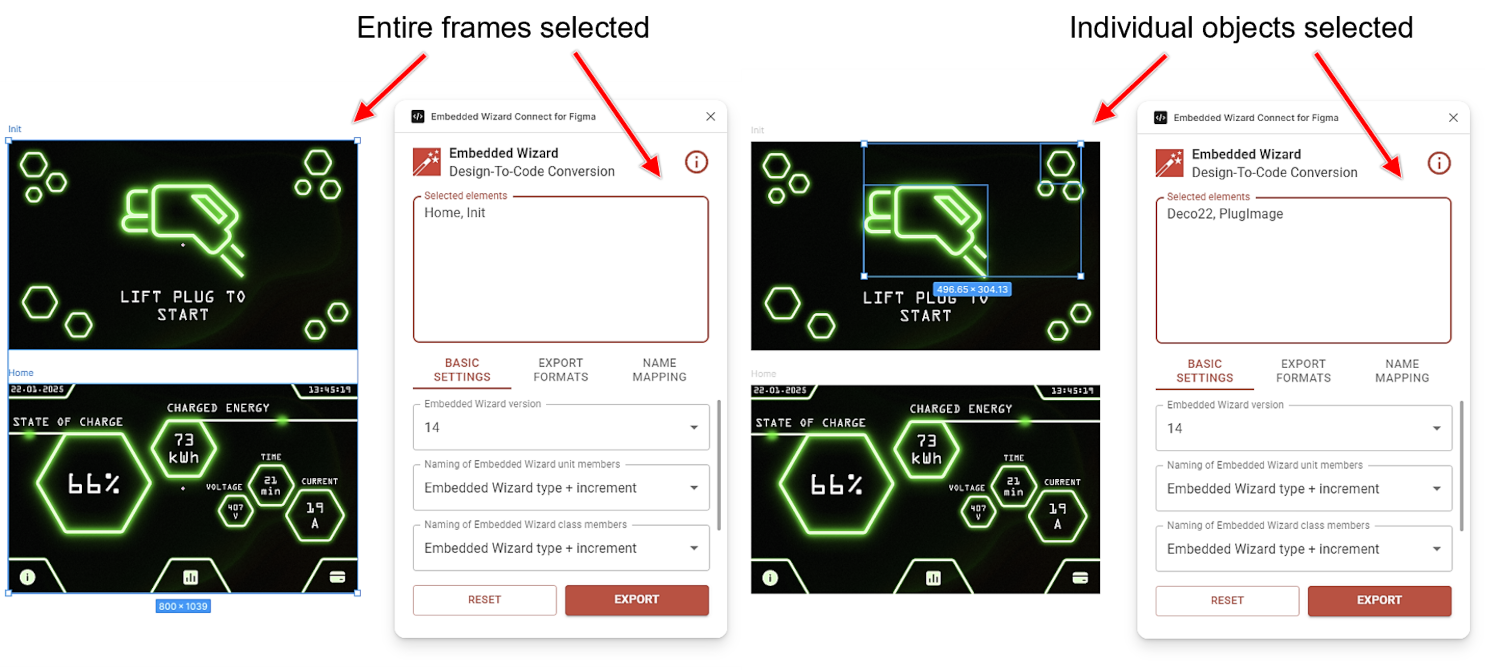 Since designers usually do not follow the same practices, it sometimes makes sense to select an entire frame, and sometimes only a part of a frame. Nevertheless, with the Embedded Wizard Connect for Figma plugin, it is very intuitive to test your optimum selection by learning through trying.