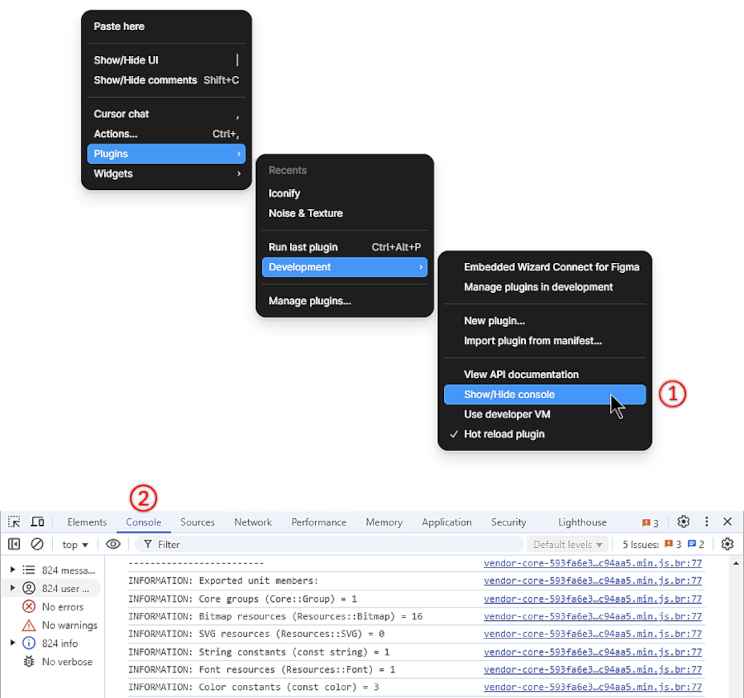 As part of the export process, the plugin records a wide range of information in the Figma development console. In certain cases, it may be useful to review this log for warnings, notifications, or errors. To access the console, navigate to . A typical console output is shown in the following screenshot: